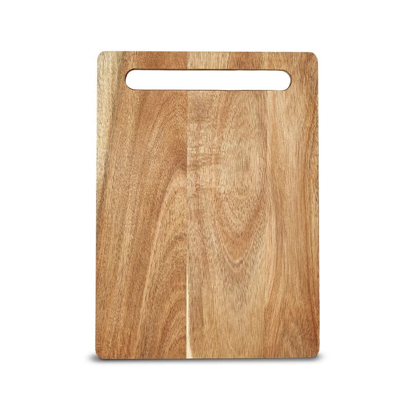 Rektangulært skærebræt i akacietræ med indvendigt udskåret håndtag.