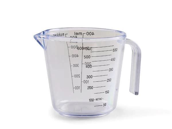 Mldente målekande med angivelser i deciliterMåler op til 600 ml. Målebæger.Rengøring bør ske med varmt vand og sæbe.