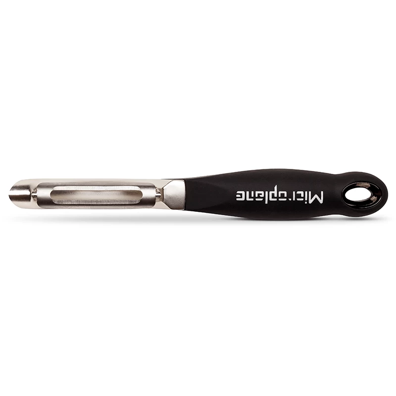 Denne professionelle grøntsagsskræller har en dobbeltsidet klinge og drejehoved, der giver dig mulighed for at skrælle frem og tilbage. Skrællekniven er udstyret med Microplanes panterede fotoætsede skær der sikrer høj kvalitet og barberbladsskarpe skær. Soft-touch håndtaget er i ergonomisk design, ligger godt i hånden og fungerer til både højre og venstre hånd. Som alle Microplane-produkter kan den naturligvis gå i opvaskemaskinen. God til alt der skal skrælles.