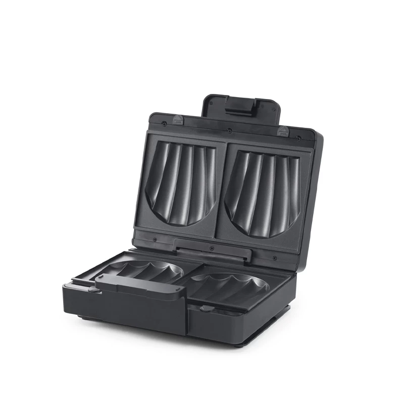 Easy Melt Toaster fra Wilfa.Med sine ekstra store skalformede plader, passer de fleste brød-størrelser heri.Belagt med non-stick belægning for at sikre stegning, uden at emnet brænder på.Pladerne kan tages af og vaskes i opvaskemaskine for nem rengøring.Et praktisk signal indikere hvornår sandwichen er klar.Kan placeres lodret, når det ikke er i brug og optager derfor ikke meget plads i køkkenet.