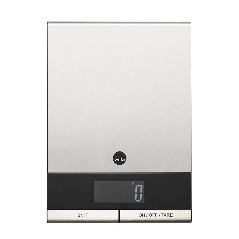 Wilfa køkkenvægt. Vejer op til 5 kg med 1 grams interval. Måler også i oz. Med tara/ nulstillingsfunktion. Køkkenvægten har gummifødder så den står godt fast og et stort let-læseligt LCD display med blå baggrundsbelysning