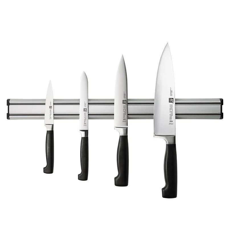 Fire stjernet knivsæt med magnet bestående af 4 knive i rustfrit stål: én urtekniv 10 cm. én tomatkniv 13 cm. én forskærekniv 16 cm. én kokkekniv 20 cm. og én knivmagnet på 45 cm i aluminium. Perfekt balanceret fuldsmede knive.